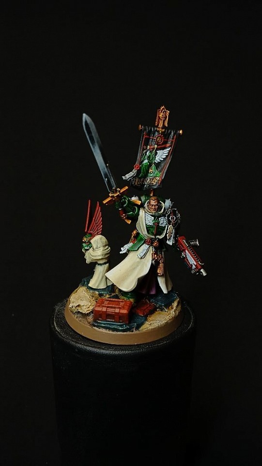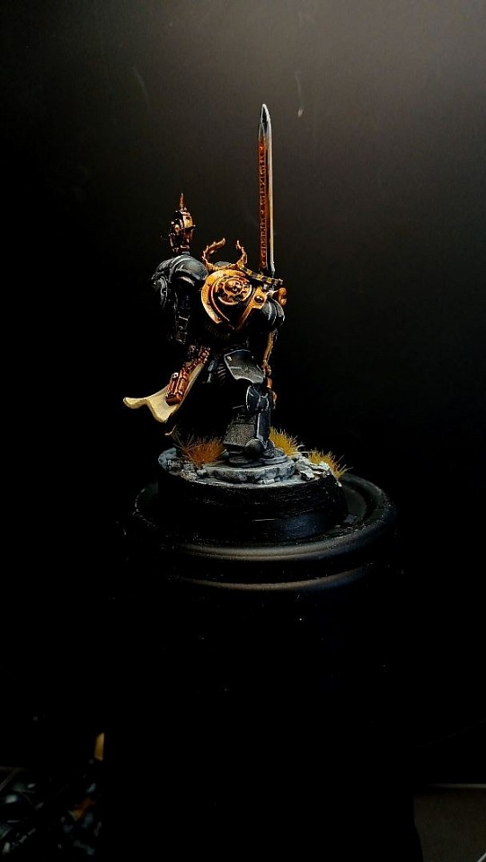 Son armure noire est relevée de bordures dorées riches et usées, contrastant avec le drapé ivoire et les teintes chaudes de son socle désertique. L' épée noir, tenu à deux mains dans une posture déterminée, annonce la sentence inévitable pour tous les hérétiques, mutants et xenos. La précision des détails, du bouclier d'épaule au sceau de pureté, souligne le soin et la passion portés à cette figurine.