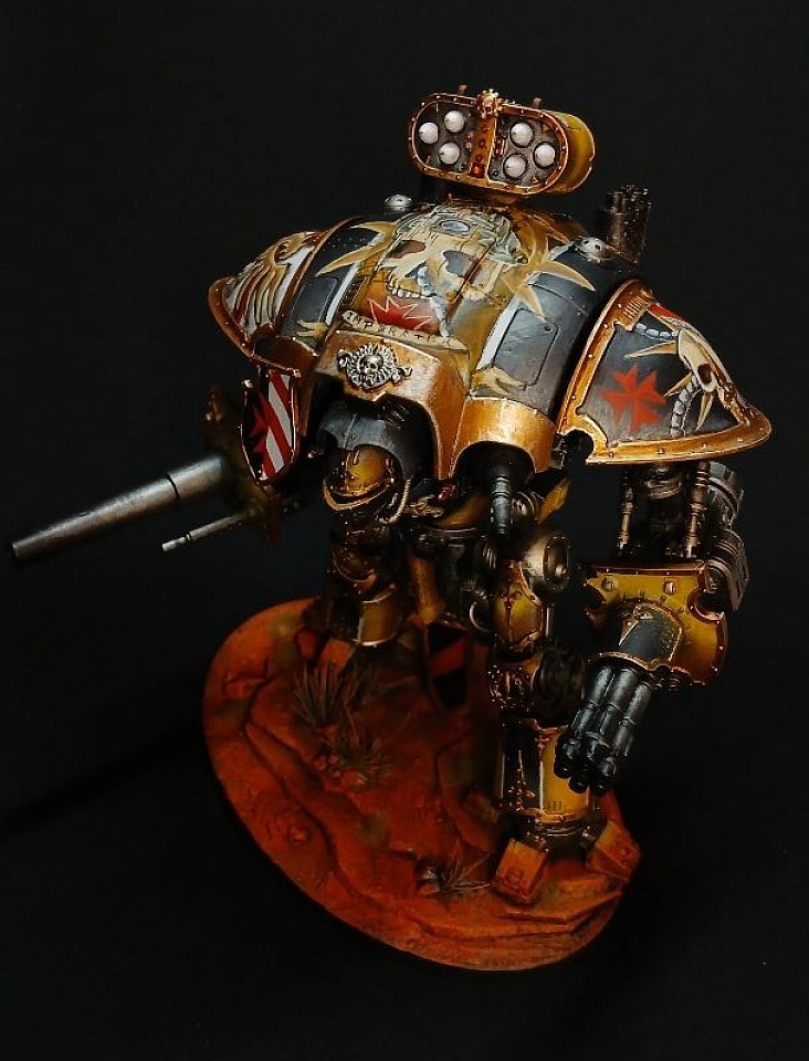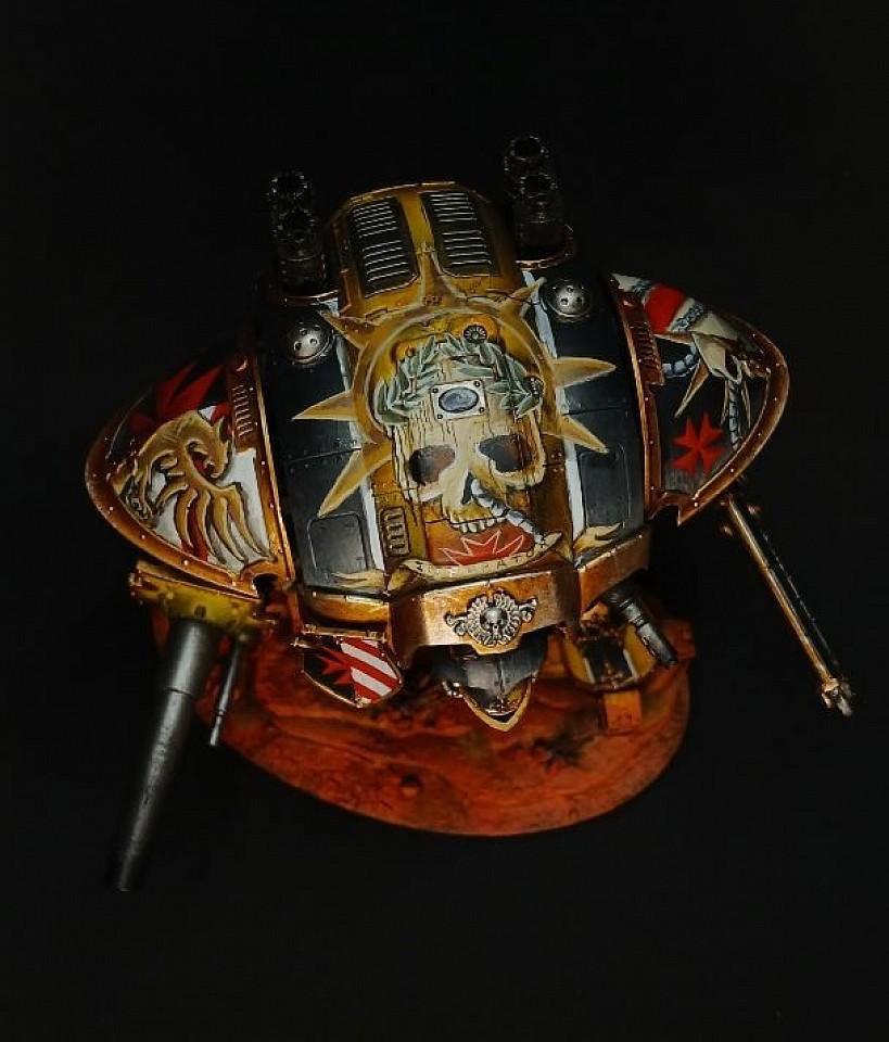 Cette pièce imposante mêle teintes dorées, noirs profonds et symboles impériaux, avec en point d’orgue une fresque peinte directement sur la carapace centrale représentant un crâne auréolé, hommage puissant à l’Empereur-Dieu de l’Humanité. Ce détail, entièrement réalisé au pinceau, témoigne du travail de précision et de passion investi dans ce projet.