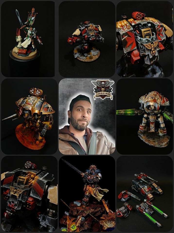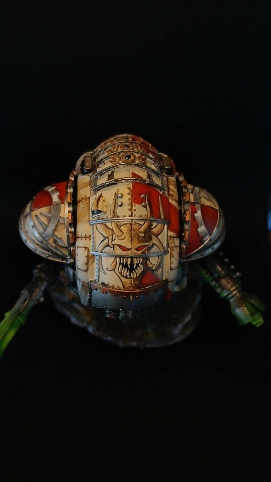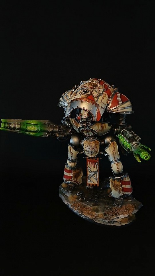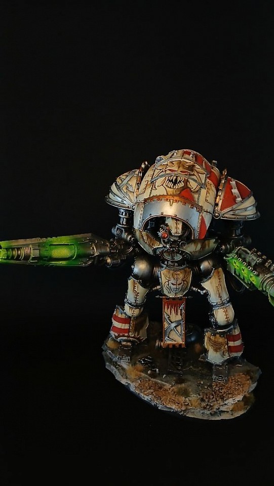 Chaque détail a été peint entièrement à la main, du freehand démoniaque sur la carapace frontale jusqu’aux armoiries éclatées, à mi-chemin entre l’iconographie impériale et les marques du Chaos. Les nuances de rouge, d’ivoire vieilli et d'acier corrodé se mêlent à la lueur verte des armes, soulignée par un effet OSL travaillé pour renforcer l’atmosphère surnaturelle de la pièce.