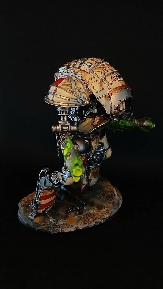 Son apparence laisse peu de place au doute : il ne s’agit pas d’un simple chevalier impérial, mais d’un véritable paradoxe mécanique. À la demande du client, ce titan incarne deux allégeances contradictoires – mi-loyaliste, mi-hérétique – comme un symbole de dualité assumée. Une blague peut-être ? Peut-être pas… mais un défi de peinture que j’ai relevé avec passion.