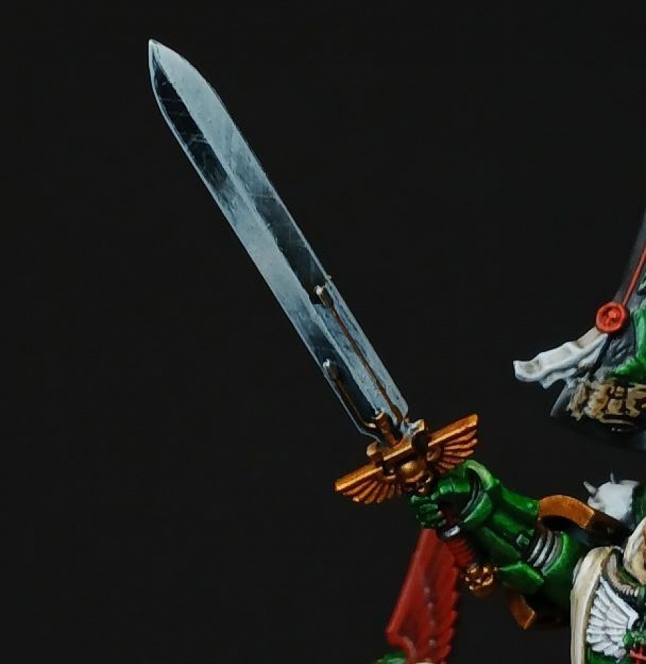 Les freehands restent d’une précision remarquable, même sur les pièces amovibles. Si tu veux aller encore plus loin, tu pourrais peut-être pousser un tout petit peu les micro-éclats de peinture (edge highlight en argent pur) sur les arêtes des armes pour accentuer l’impression de métal poli par l’usage.