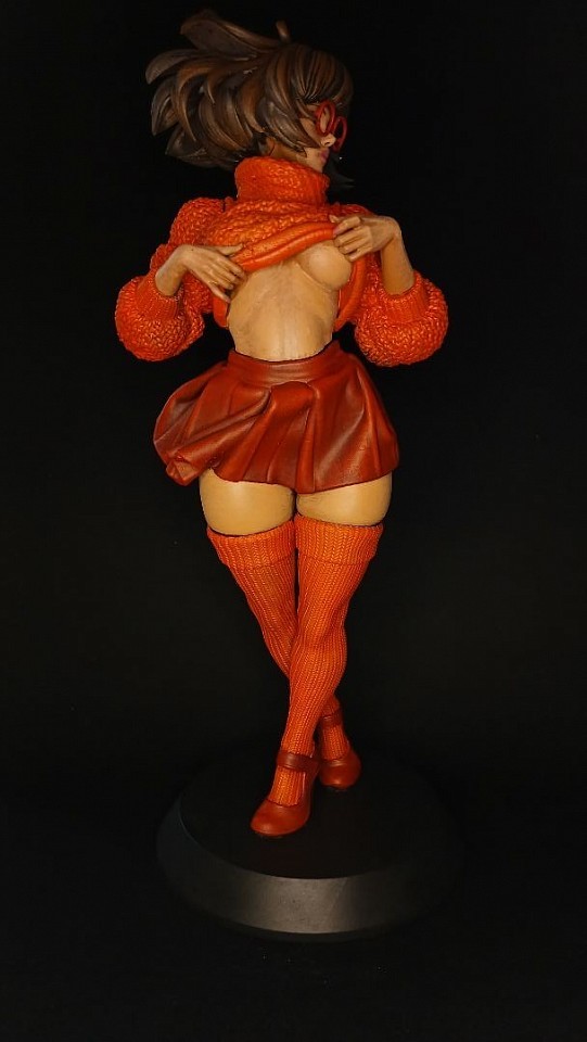 Cette interprétation haute en couleur de Velma assume pleinement son audace. Dominée par des nuances d’orange profondes et chaleureuses, la figurine joue avec les contrastes de textures et de matières, mettant en valeur chaque détail, du tricot du pull aux plis de la jupe, jusqu’aux subtilités du travail de peau. La pose, à la fois dynamique et affirmée, donne à la pièce une présence visuelle forte et assumée.